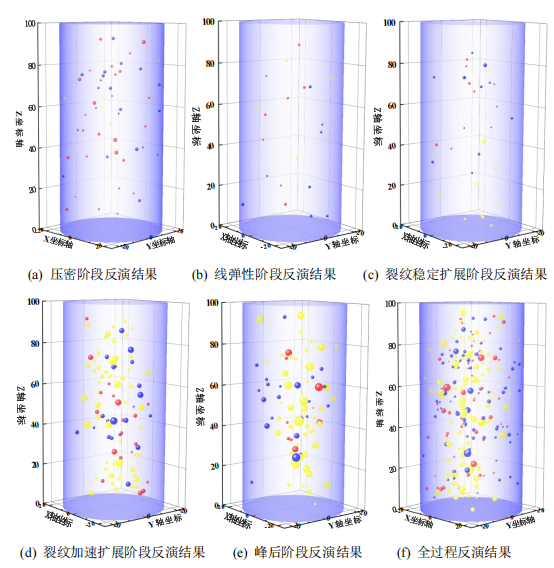 示图一:某岩石试验在不同裂纹扩展阶段内的声发射矩张量反演结果